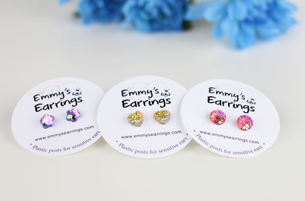 Emmy’s Earrings are designed with sensitive ears in mind. All of our earrings are made with a hypoallergenic plastic post or implant grade stainless steel.
